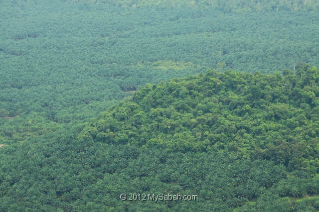Forest surrounded by oil palm plantation. Without forest reserve status, this forest would be long gone.