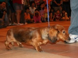 Puppy hide under his master. Dog Talent Show, Asia City Complex, Kota Kinabalu, Sabah, Malaysia