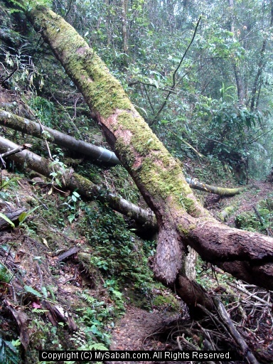 A big tree blocking the way. Liwagu trail, Kinabalu National Park, Sabah, Malaysia