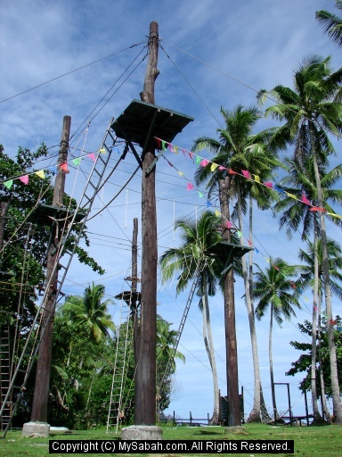 The structure for 25-feet high rope challenges. There are 5 different types of rope for you to cross. Scary and difficult, but safe.