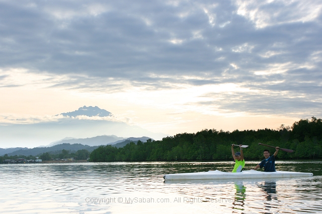 Kayaking in Mengkabong River of Tuaran, Sabah Malaysia, with Mt. Kinabalu as backdrop