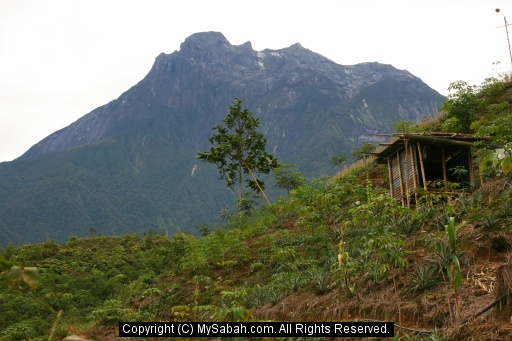 The view of Mount Kinabalu from Kiau. Note the tapioca and pineapples planted near the hut.
