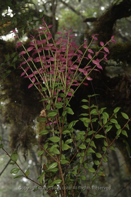 Syzygium sp. plant with green and red leaves along the summit trail of Mt. Trus Madi, the second highest mountain of Malaysia
