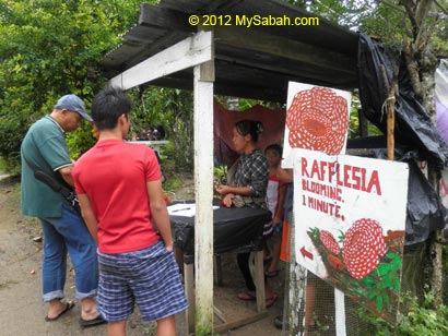 On the way to Poring Hot Springs, there are a few families which have rafflesia grows on their land. Whenever there is any rafflesia blooming, they will erect a banner next to the roadside to announce it. However, rafflesia has no predictable blooming season and its flower can last only 6 days, so the tourists need luck for such amazing sight.