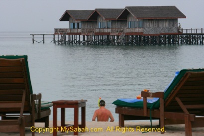 The chalets are built on high wooden stilts on the sand and connected by boardwalk. At night you can see marine lives such as lionfish, sting ray and even turtle swim under the walkways. There is an opening on the deck of the restaurant. You can see schools of fish passing under the viewing hole.