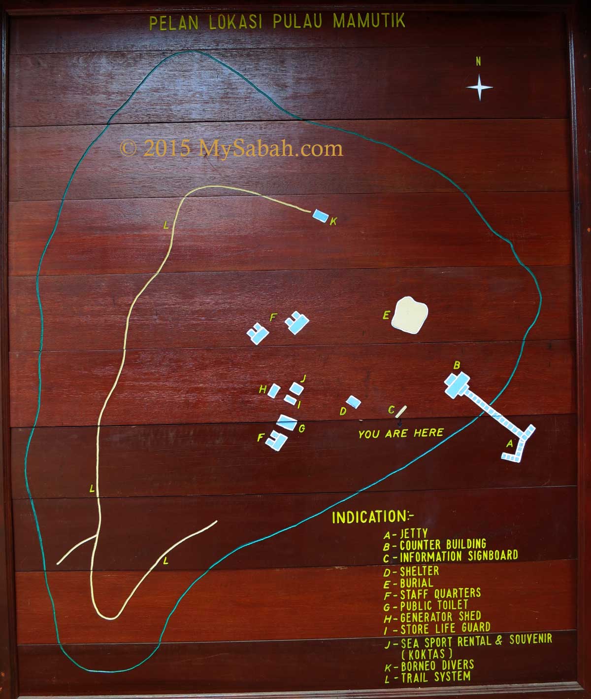 Mamutik definitely has the facilities to fulfil tourists’ two most basic needs, i.e. call of nature (toilet) and food. Changing rooms, picnic shelters, tables and benches are free for public use too. The following is a layout map of the facilities on Mamutik: