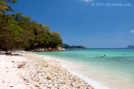 Mamutik Island has long stretch of white sandy beach about 200 Meters in length. The sea can be choppy occassionally and the water is getting deep after 10 Meters from shore, so be careful if you don’t know how to swim.
