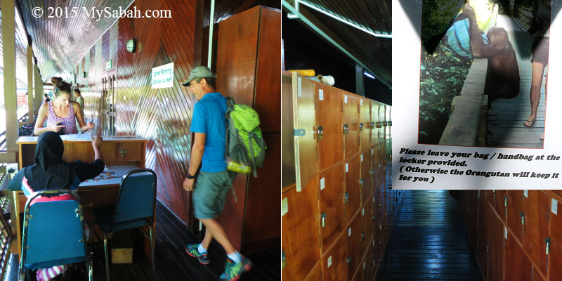 Visitors are not allowed to carry their bag, food / drink and insect repellent (poisonous to orangutan if they get ahold of it) to the forest. Orangutans and monkey are highly curious and won’t hesitate to rob any object they find alluring. Visitors can store and lock their bags (for free) in locker of visitor building. Still, you must remain vigilant because your smartphone or shiny jewellery could be a target.