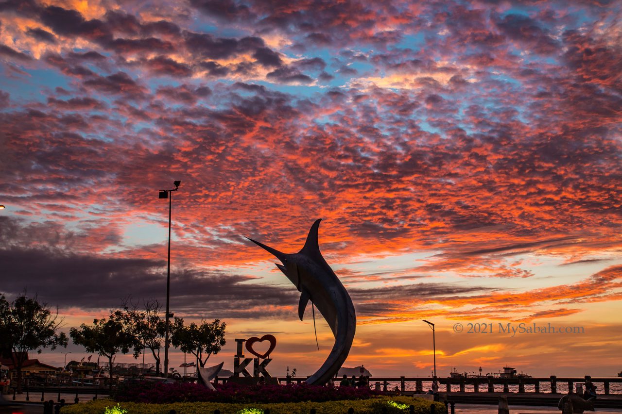 • Sunset of Kota Kinabalu city at Marlin statue (Todak) with Cirrocumulus clouds