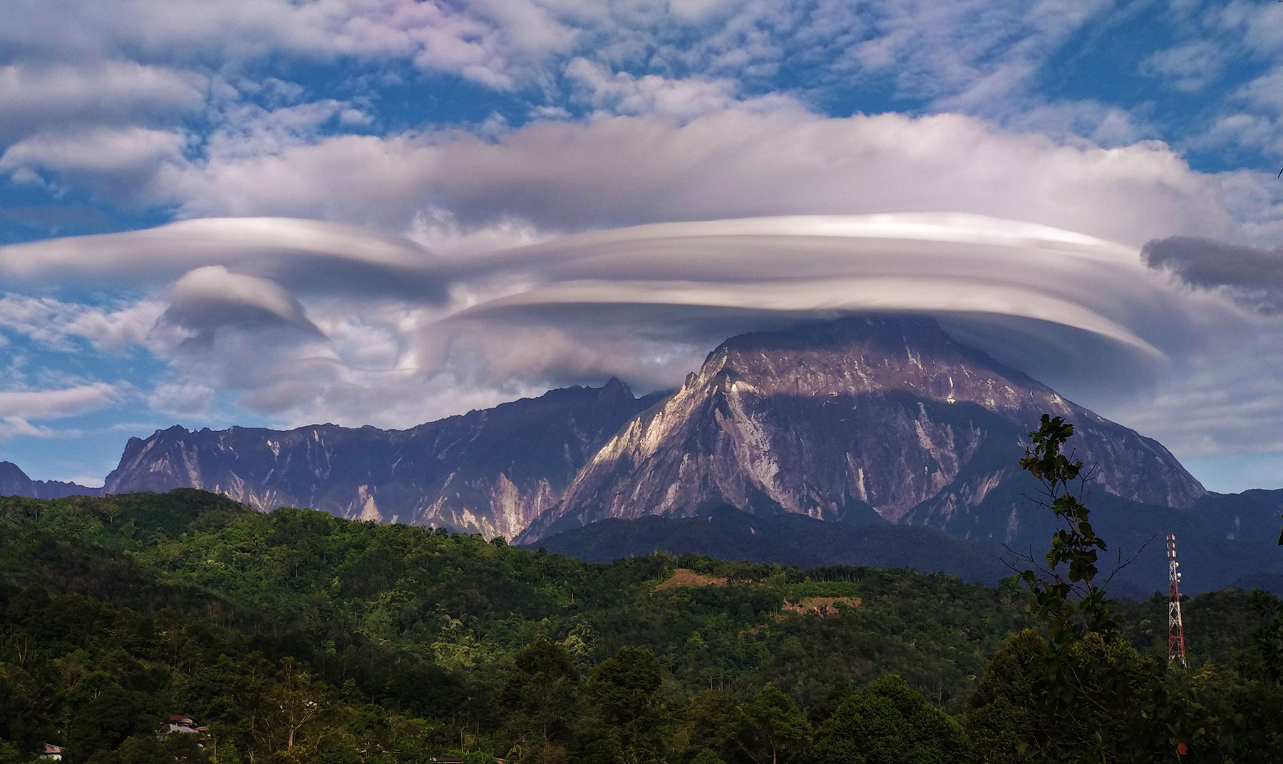 Sometimes a saucer-shaped cloud hovers like a UFO over the summit of Mount Kinabalu, as if the mountain is wearing a hat. It’s lenticular cloud, also known as UFO clouds and Wave clouds. To foodies, it might look like someone spray whipped cream on top of our mountain.