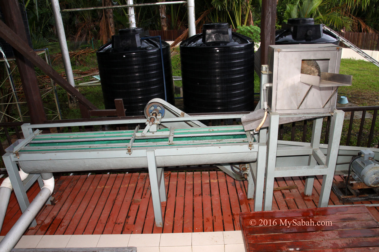 The traditional method is very labor intensive and time-consuming. Nowadays, electrical sago processing machine can grate, filter and collect the sago starch. You can see this machine demo in Sago Information Center.