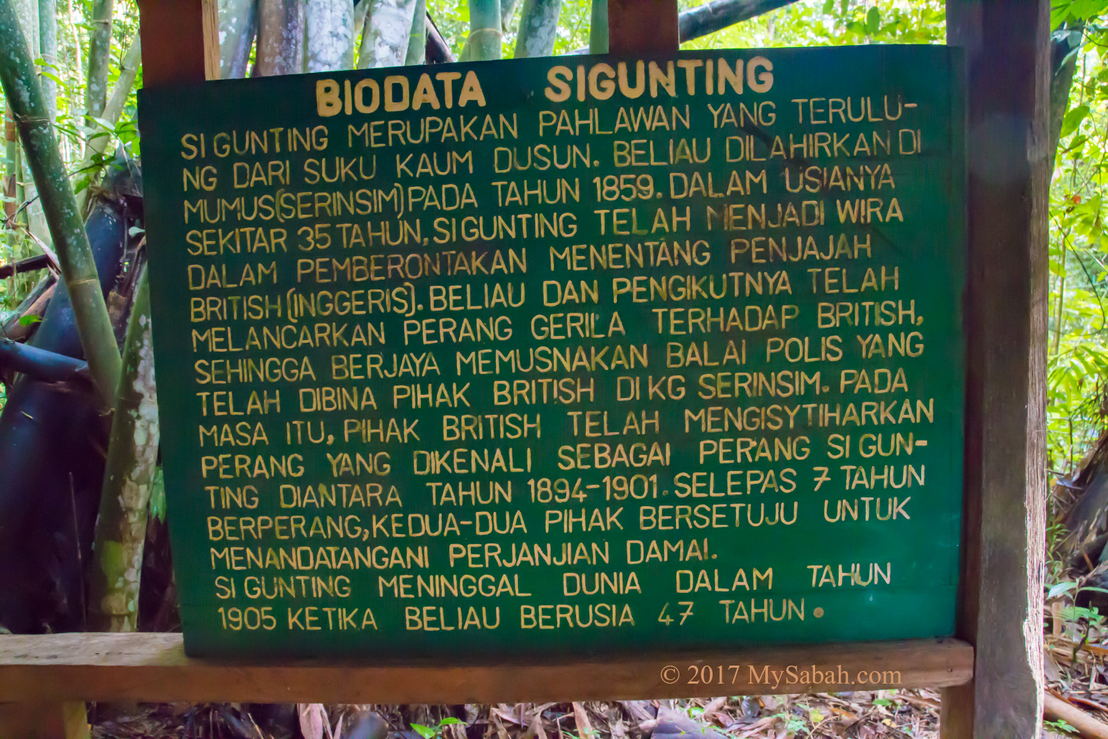 Sigunting is a Dusun warrior born in Mumus (Serinsim) in 1859. When he was 35 years old, he led a 7-year guerrilla warfare against the British colonial government between 1894 and 1901 named Perang Sigunting.